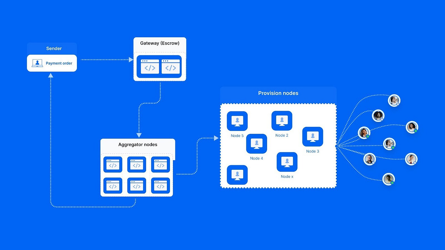 The Routing Layer (Intelligence): An Aggregator node scans the network for verified providers. It matches the order not just on price, but on reliability and speed, routing around outages in real-time.