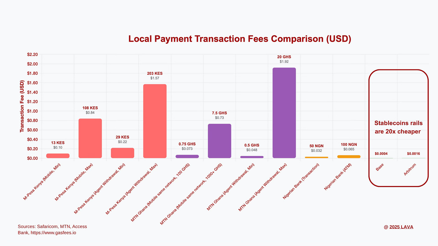 But mobile money and online banking aren't cheap. The chart below shows a cost comparison between three payment networks and stablecoin payments on leading L2s.