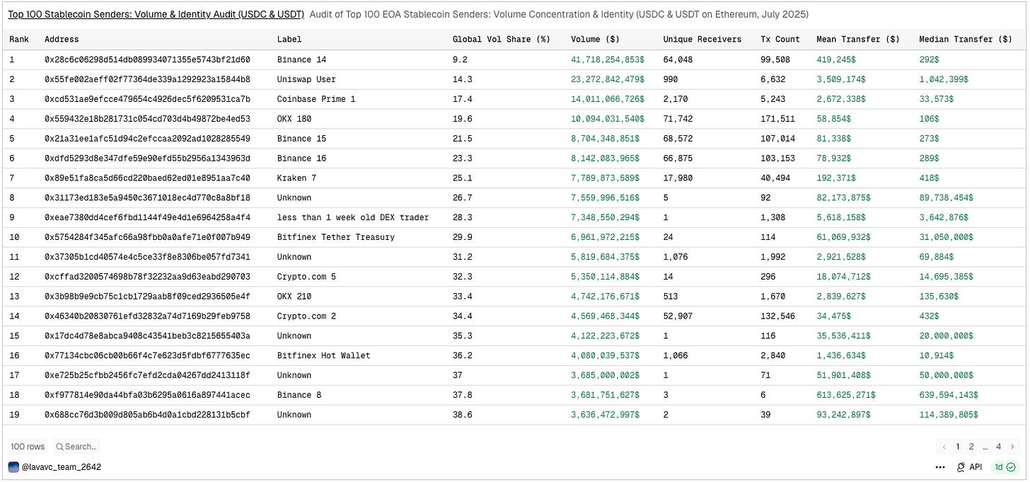 At this point, the paper stops at a high-level question—whether stablecoins will evolve into an intermediary-led or P2P system. To understand what this volume actually is, we audited the Top 25 addresses (>$150B combined) by cross-referencing identity labels and analysing behavioural fingerprints (median transfer size and unique receiver counts).
