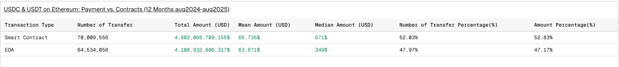 Self-Custody vs. Payments: The EOA-to-EOA (Externally Owned Account) filter cannot distinguish between a merchant payment and a user moving funds between their own wallets (e.g., Exchange to Ledger). This becomes increasingly meaningless as more people and products adopt “smart accounts” based on Account Abstraction.